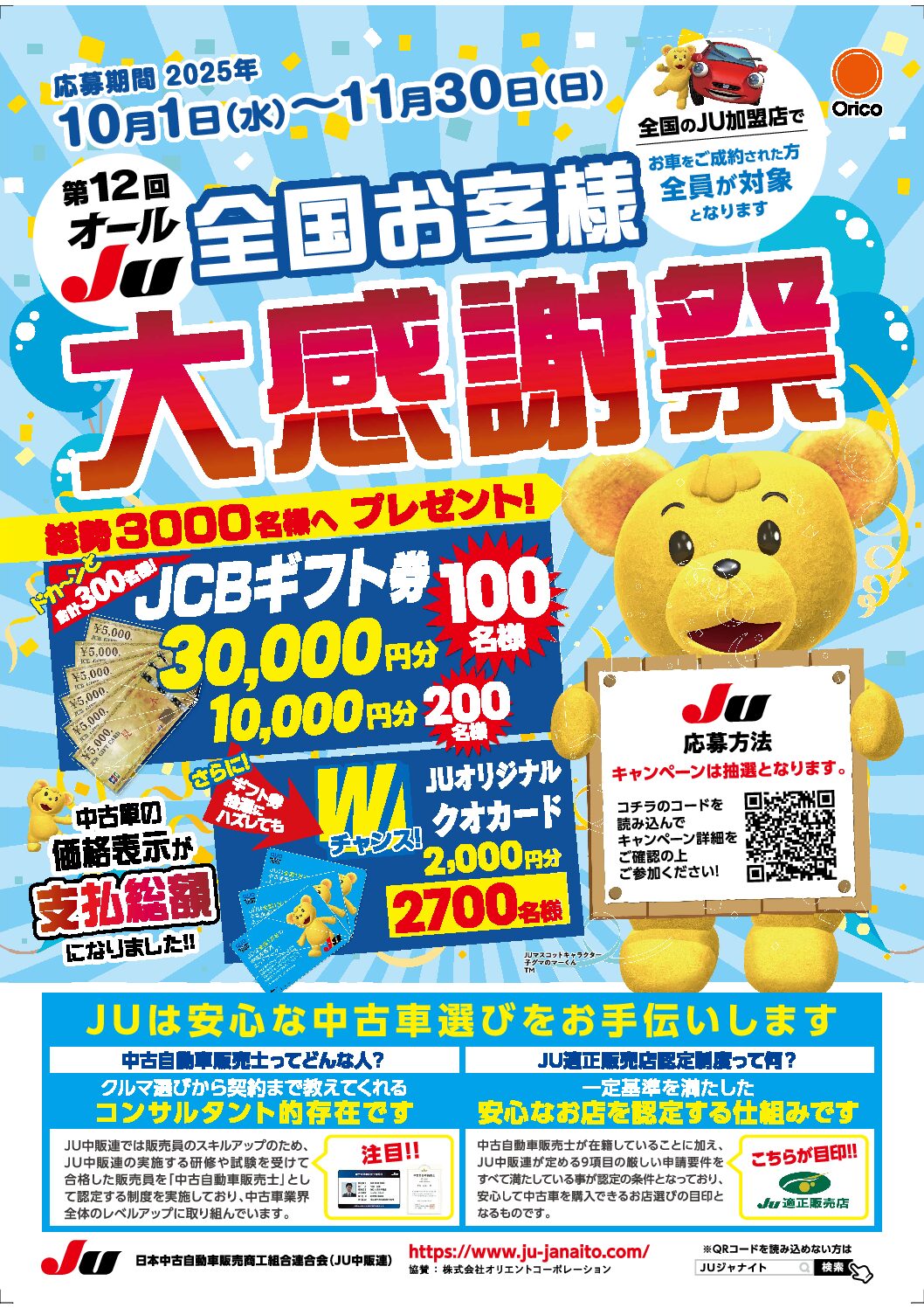 2025年10月1日(水)~11月30日までにJU加盟店でお車をご成約された方、全員が対象です。